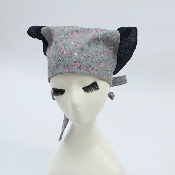 Yağa Dayanıklı Mutfak Önlüğü Seti - Üçgen Türban, Çiçek Desenli, Büyük Dantel, Lacivert