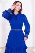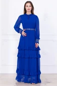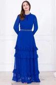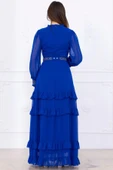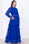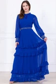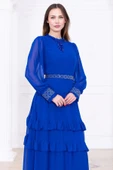 - Yaka İşlemeli Taşlı Kol ve Kemer Detaylı Kat Kat Abiye Elbise 2756-Saks